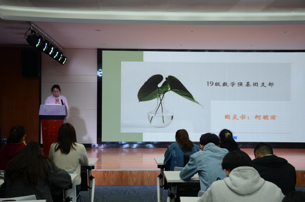 大会开始,全体同学起立,奏唱团歌,各支部的展示也正式开始。所有支部均从支部建设情况、活动展示、支部风采三个方面,展示支部的独特风采。其中,数学1803团支部汇报人凭借其独特的嗓音有力地抓住了所有人的目光,并结合师范班的特色活动——黑板字比赛,展示了一个努力奋斗的集体;数理金融1801团支部凭借着优秀的成绩,各种竞赛中的优秀表现,展现了班级积极向上的优异品质;信息与计算科学1802团支部介绍支部多名优秀团员们组成的“初阳献血志愿服务队”多次积极参加志愿献血活动,展示团员们对志愿公益的热爱;19级数学师范团支部通过三个令人发省的问题,展示了这个团支部对于团学工作的思考;19级信息处理团支部通过对团支部介绍、年度工作总结、特色团日活动展示和支部优秀团员荣誉这几个方面展示了支部的努力成果;19级应用统计学团支部通过特色团日活动展示作为“试点团支部”努力开展活动的决心与意志。