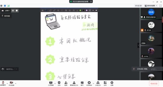 本次会议的主持人刘与进宣布会议开始后,首先由主持人刘与进为介绍了此次会议的主要目的。随后邓念斌就比赛经验开始进行分享,主要从前期准备、数据搜集、数据分析、对策建议这四个方面进行了介绍,并且为同学们指出了清晰的研究思路。之后柯琦也通过丰富的比赛经验告诉同学们,在选题上,一个良好的选题就是成功的一半,选题一定要贴近社会热点问题,具有可操作性。同时,在前期准备上,可以通过定量与定性相结合,以结果为导向来确定分析方法,同时数据搜集时应该注意:问卷的统计汇总阶段最容易出现问题,在这个过程应该尤其仔细认真。最后,调查得出的结论应该在行业内外进行对比,并且要具有创新思维和拓展思维。