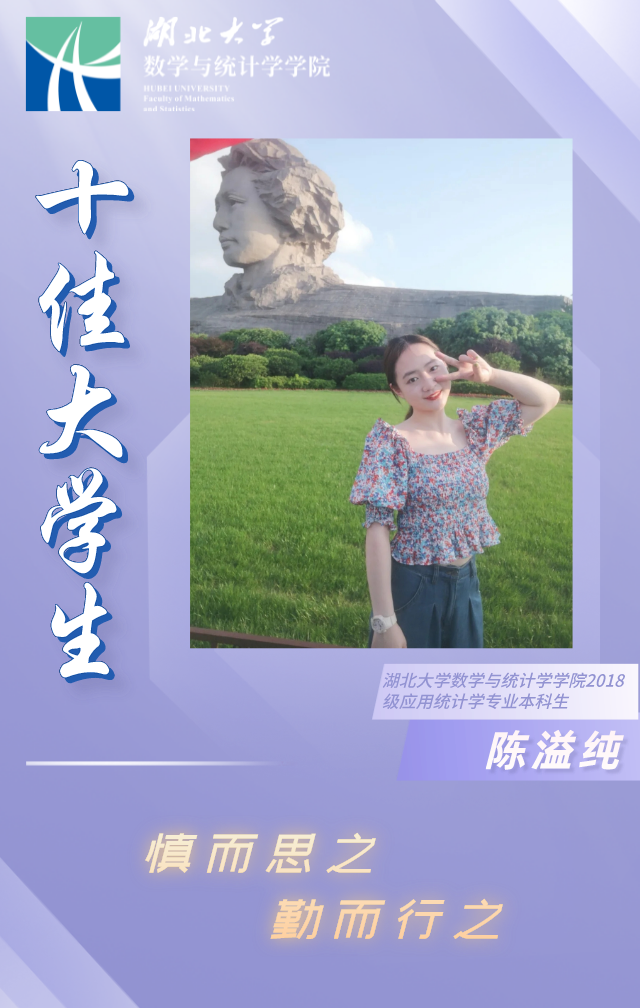 陈溢纯,女,汉族,中共党员,湖北大学数学与统计学学院2018级应用统计学专业本科生,学院青马班学员。曾任应用统计学1802团支部团支书、班级学委、学院组织部干事、学院团委副书记等职,入选第24届研究生支教团。