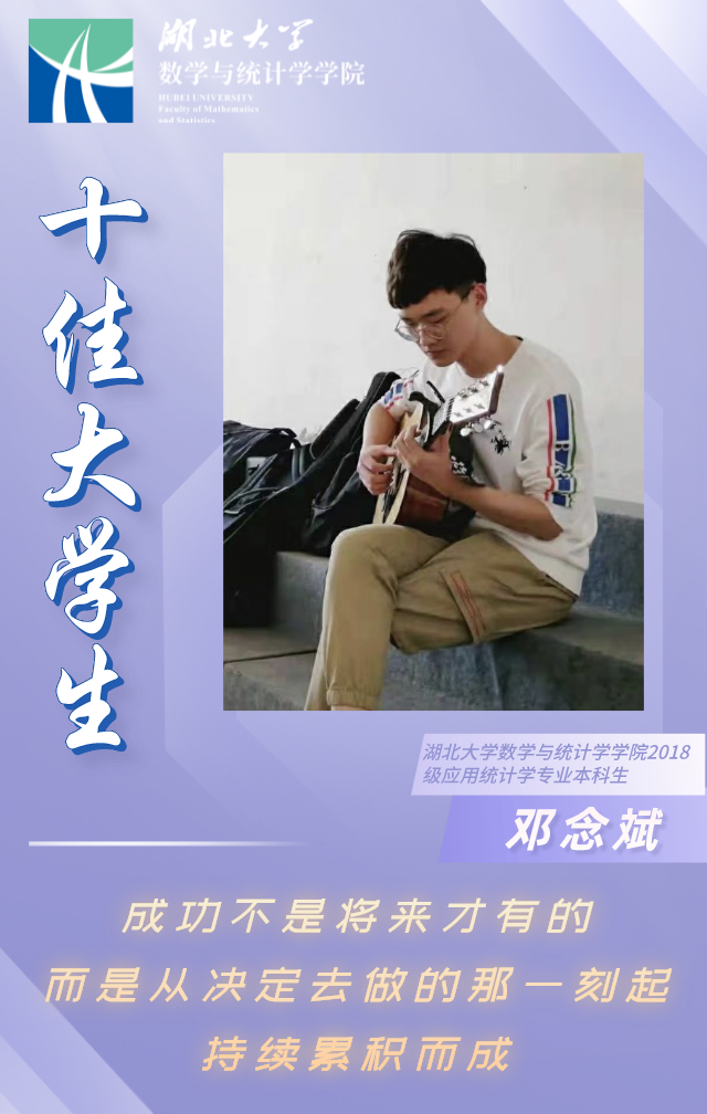 邓念斌,男,数学与统计学学院应用统计学2018级本科生,目前已保送至中南财经政法大学攻读应用统计(大数据分析)硕士学位。