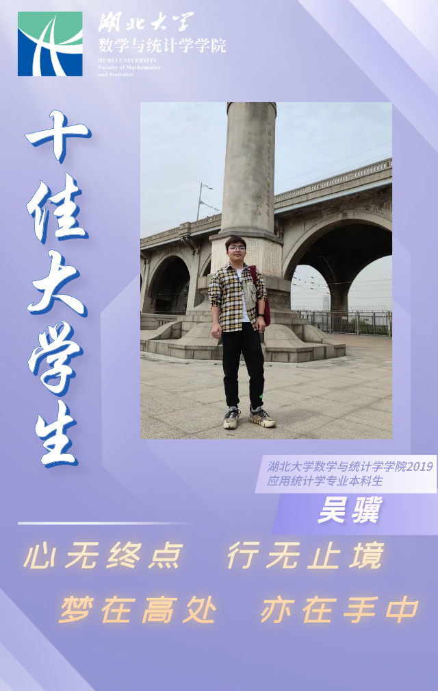 吴骥,男,共青团员,数学与统计学学院应用统计学1901班本科生,现任湖北大学数学与统计学学院学生组织联合会主席、班级生活委员,曾任第三届湖北大学数学与统计学学院研学代会学生代表,学院团委部门干事。