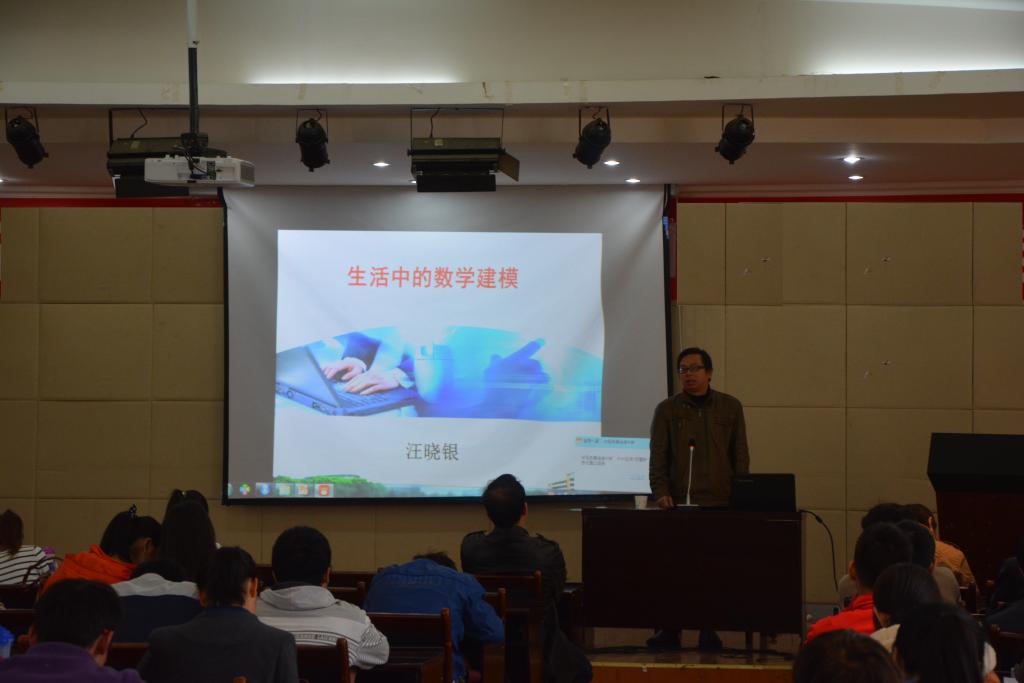 讲座还未开始,八楼报告厅已经座无虚席。汪教授以数学建模对大学生成长成才的影响为主题拉开了讲座的序幕,他幽默风趣的讲课风格引来了在场同学们的阵阵热烈掌声。在讲解到数学建模能够解决何种问题时,他用学习成绩与迟到次数为例子,生动形象的讲解了它们之间的比例关系,使同学们对建模有了一个初步的认识。随后他用历年的数模竞赛真题由浅入深,层层推进,原本抽象的数学原理在他口中也变得生动非凡。最后,他希望同学们能够克服对数学建模的恐惧,修正对数学建模的曲解,拓展自己的知识面,注重方法,发散思维,锻炼自己,在数学建模的过程中体会到快乐与成就感。