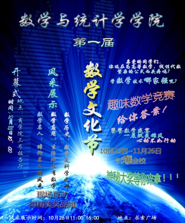 湖北大学数学与统计学学院第一届数学文化节开幕式将于10月22日上午10点在三号楼学术报告厅举行,欢迎广大师生前来参加!