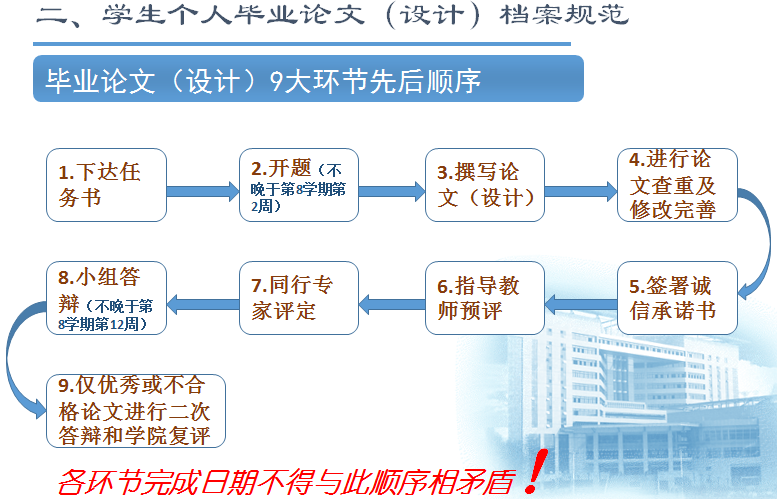 “毕业论文(设计)文本” 依次包括本科毕业论文(设计)封面、诚信承诺书、目录、摘要及关键词(中英文)、正文、参考文献、附录、致谢、外文翻译(译文在前,原文在后),连同第5项“成绩评定表”依次胶装成一册,各项内容根据学校《湖北大学毕业论文(设计)工作条例》有关格式和要求完成;需签名处手写签名;封面和封底由学校提供。