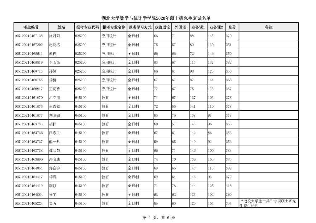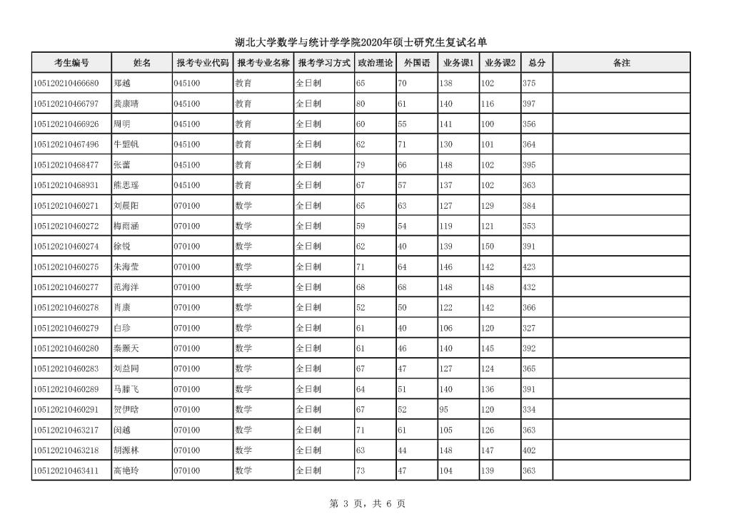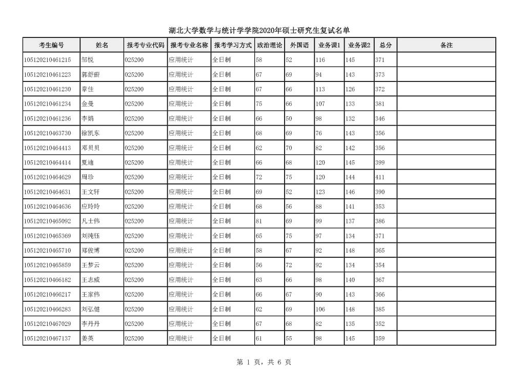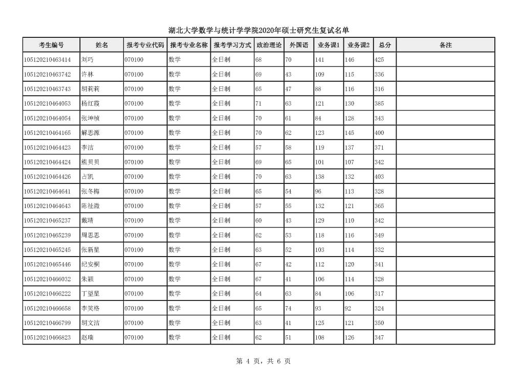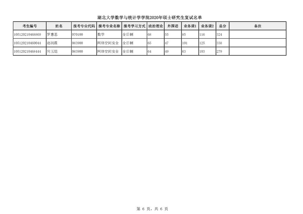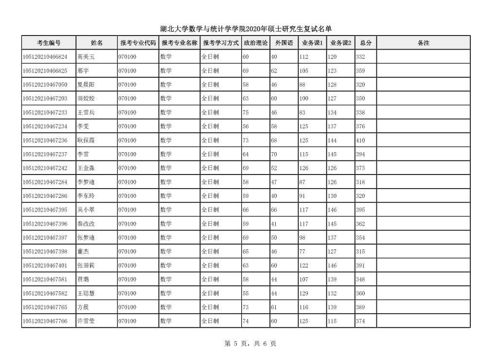 湖北大学数学与统计学学院2020年硕士研究生复试名单
