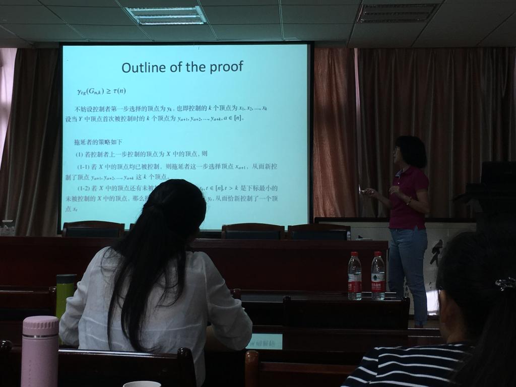 陆玫教授的报告题目为《Game total domination》。报告中,她首先简单地介绍了这篇文章的基础知识点,其次深入地讲解了total domination的定义和应用,然后重点讲解了game total·domination,并得出了一些重要的结论。