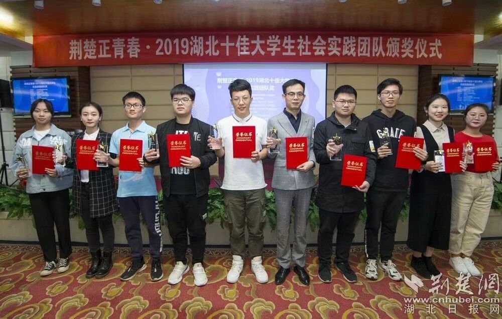 11月9日,由荆楚网(湖北日报网)主办的“荆楚正青春•2019湖北十佳大学生社会实践团队”颁奖仪式举行,我院“江城六茶客”团队荣获“2019湖北十佳大学生社会实践团队”称号。