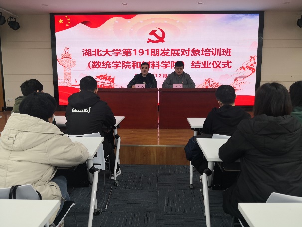 2020年12月7日中午12:00,湖北大学数学与统计学学院联合材料科学与工程学院第191期发展对象培训班(数学与统计学学院和材料科学与工程学院)结业仪式于数学与统计学学院八楼报告厅召开。结业仪式由海角天涯社区网页入口登录团委书记周杰主持,海角天涯社区网页入口登录党委副书记陆伟出席会议。