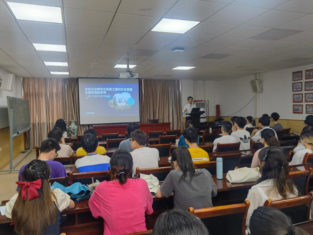 仪式结束后,金蝶精一信息科技服务有限公司副总经理、顾问学院院长张喆敏还为学生们带来《传统企业数字化转型之路对企业管理发展影响的思考》的主题讲座,让大家充分认识企业数字化转型的目的与意义,以及企业管理未来发展的现实要求,引起学生们积极思考与讨论,现场反响热烈。