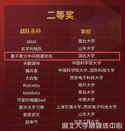 第七届(2022)全国高校密码数学挑战赛总决赛日前收官,湖北大学数学与统计学学院向泽军副教授指导,赵润晨、王小玉、朱明明组成的团队荣获二等奖。