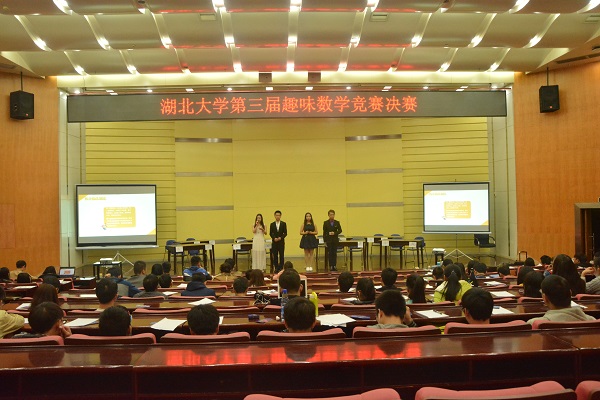 11月4日晚,为了推广弘扬数学文化,让大家在参与数学文化竞技活动中感受到其中的趣味与奥妙,湖北大学数学与统计学院于思睿厅举办了第三届趣味数学竞赛决赛。本次决赛综合了传统数学文化、趣味数学知识等元素,以同台合作、多元竞技、交流互动等方式开展。32位进入决赛的学生每二人分为一组,共16个小组,比赛采取积分淘汰制,经过“多米诺骨牌和数独”、“汉诺塔”、“风险答题”、“逻辑推理分析与演示”四轮比赛,逐轮淘汰,最终决出冠军。在各位选手竞争时,屏幕上会投放出同样的题目供现场观众参与作答,有的同学答题速度甚至比选手还快,在礼仪的检查后还可以获得小奖品,现场氛围十分活跃。
