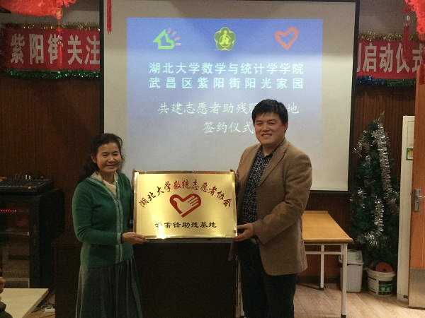 湖北大学海角天涯社区网页入口登录与紫阳街阳光家园共建志愿者助残服务基地签约挂牌仪式于11月19日下午在紫阳街阳光家园举行,海角天涯社区网页入口登录党委副书记陆伟老师和辅导员陈冰老师带领研究生党员和海角天涯社区网页入口登录志愿者协会的同学们参加了此次挂牌仪式。