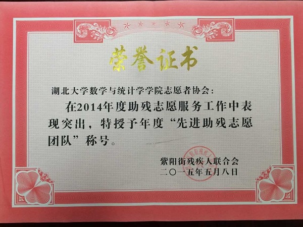 5月8日,我院青年志愿者协会应邀参加紫阳街阳光家园助残志愿者表彰大会。紫阳街残联主席对前期坚持为残障人士无私奉献的优秀团队和个人进行了表彰,并颁发荣誉证书。我院青年志愿者协会获得年度“先进助残志愿团队”荣誉称号,四名志愿者获优秀志愿者的称号。