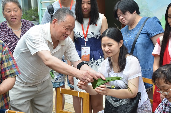 上午8点,一行人便来到了阳光家园。学生党员们主动帮助社区义工们准备包粽子的材料,淘米、洗粽叶、搭场地。“想着等会能包粽子,浑身都有干劲,以前都没有包过粽子。”罗成辉同学这样说道。在所有准备工作完成后,包粽子在大家的期望中拉开了帷幕,社区居民自发展开了比赛,同时也为我们院师生党员做简单的教学。“我以前从来没有包过粽子,这是我第一次看别人包粽子,社区居民好厉害,包的又好又快,值得我们学习。”青年党员教师彭江涛看着社区居民们包粽子时说。游书记也耐不住手痒,看着旁边社区居民包粽子的手法,一步一步的进行着。“好久没有包过粽子了,都已经忘了,多亏了他老人家指点,不然上面装下面漏。”游书记拿着他包好了的粽子高兴的说。青年党员教师为阳光家园的朋友们包了很多粽子。