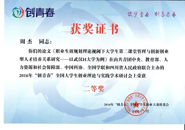 比赛期间,组委会组织了2016年“创青春”全国大学生创业理论与实践学术研讨会。我院辅导员周杰撰写的论文《职业生涯规划理论视阈下大学生第二课堂管理与创新创业型人才培养关系研究》荣获二等奖。